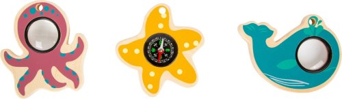 Všichni dobrodruhové a nadšenci pro oceány pozor! S těmito hračkami budete dobře vybaveni pro plavbu na moři. Hvězdice s integrovaným kompasem ukáže dětem směr, velryba jim pomůže mít vše „v merku“, zatímco chobotnice nabídne nový pohled na věc. Hračky – nástroje mají otvor pro provázek, děti si je tak mohou zavěsit kolem krku, také je mohou nosit v kapse.