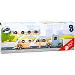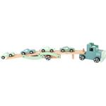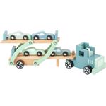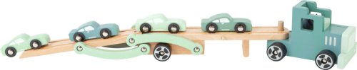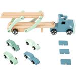 Velká kola jedou! Tento kamión s návěsem na automobil vychází z velkých mezikontinentálních kamionů a inspiruje barevným schématem „modré oceli“. Transportér je kompletně vyroben z přírodního dřeva. Díky tomu je ideální pro dlouhodobý herní zážitek. Dva ze čtyř turborychlých sportovních vozů se jednoduše naloží na sklopnou horní palubu - to zajistí nakládací rampa. Skvělý transportér automobilů, který by neměl chybět v žádném dětském pokoji. Hlavní vlastnosti: sklopný návěs pro 4 autaobsahuje 9 částíklasický design v modrošedé barvě