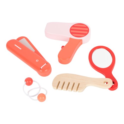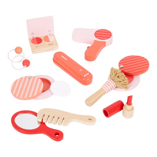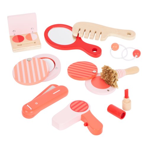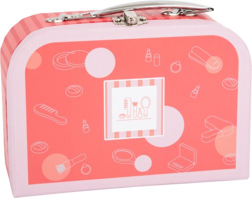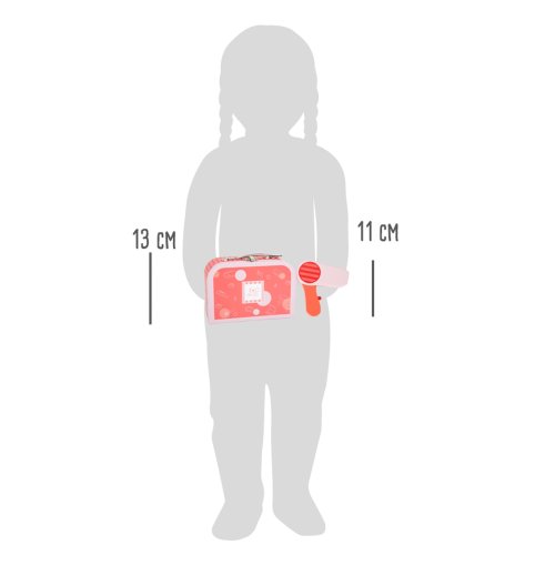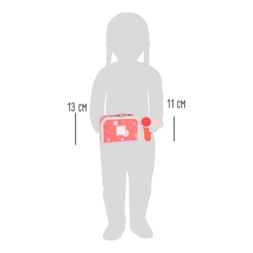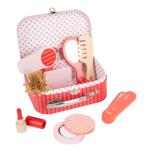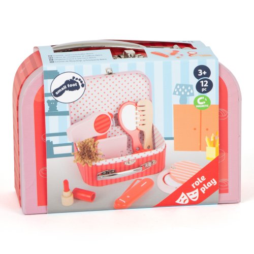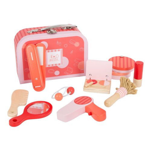 Make-up umělci a umělkyně, toto je pro vás! Kosmetický kufřík vyrobený ze dřeva je perfektní pro hraní na role. Obsáhlý set se skládá z hřebenu, zrcátka, fénu, rtěnky, pudru, očních stínů, žehličky na vlasy a také gumiček. Konečně se můžete namalovat jako maminka! Kufřík má zámek, všechny doplňky se do něj vejdou pohodlně. Kdo si nechá upravit vlasy jako první? Hlavní vlastnosti: 10 různých kosmetických pomůcekpraktické balení