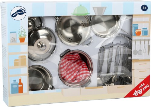 S touto sadou nádobí skládající se z různých hrnců a kuchyňského náčiní se každé malé dítě může stát špičkovým kuchařem, nebo kuchařkou. Součástí sady je chňapka a stojan s kuchyňskými pomůckami. Takže popadněte naběračku, připravte se a pusťte se do vaření. Tato sada je ideální doplněk do dětské kuchyňky. Hlavní vlastnosti: obsahuje 13 dílůpodporuje kreativitu a nápaditostrozvíjí sociální dovednostizlepšuje obratnost a motoriku