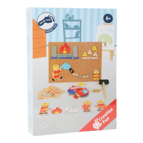 S touto hrou si může každé dítě vyrobit svou vlastní hasičskou stanici na nástěnné desce. Dřevěné a kartonové dílky skládačky mají předvrtané otvory, malé hřebíčky lze snadno zatlouct do korkové desky dřevěným kladívkem. Balení obsahuje také čtyři oboustranně potištěné karty s návrhy motivů. Hlavní vlastnosti: podporuje kreativitu a koncentracipodporuje jemnou motorikupraktický úložný box