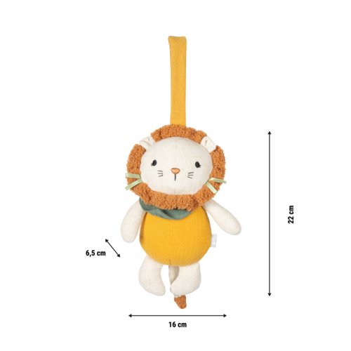 Jemné zvuky pro sladké sny!Tato s láskou navržená plyšová hrací hračka ve tvaru lvíčka není jen uklidňujícím pomocníkem při usínání, ale také stylovým doplňkem do dětského pokoje. Díky příjemně měkkému materiálu, kvalitní mušelínové látce a veselému designu se rychle stane oblíbeným společníkem miminek i batolat při usínání, mazlení i odpočinku. Ať už ji zavěsíte nad postýlku, na kočárek nebo k přebalovacímu pultu, díky praktickému poutku je Lvíček vždy po ruce. Po zatažení za šňůrku začne hrát uklidňující melodie „Twinkle, Twinkle, Little Star“. Látkový Lvíček spojuje okouzlující vzhled s praktickým využitím a pomáhá navodit harmonický denní i noční režim. Jemná melodie spolu s hebkým povrchem podporují smyslové vnímání a pocit bezpečí, který je v prvních měsících života miminka klíčový. Díky své kompaktní velikosti se skvěle hodí do postýlky, kočárku i na přebalovací pult. Je to promyšlený dárek k narození dítěte, ke křtu nebo jako milá pozornost pro novopečené rodiče a zároveň krásný doplněk k dalším produktům z designové řady Little Lion“ Hlavní vlastnosti: látková hrací hračka s veselým designem lvíčka uklidňující a dobře známá ukolébavka - Twinkle, Twinkle, Little Starmušelínová látka s příjemnou texturou na dotek praktické poutko pro snadné zavěšení na postýlku, kočárek apod. ideální jako pomocník při usínání kompaktní velikost pro malé dětské ručičky vhodná od narození