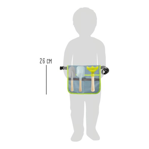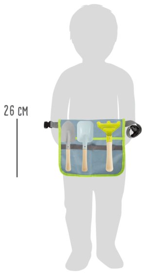 S touto ledvinkou na zahradní nářadí mohou mladí a začínající zahradníci opravdu pomáhat na zahradě a přitom mít volné ruce. Jednoduše si nasaďte snadno nastavitelný opasek s cvakací sponou a výsadba může začít! Lopata, hrábě a rýč jsou vyrobeny z kovu, mají velikost vhodnou pro děti a stabilní dřevěné rukojeti. Zábava na vlastní zahradě je zaručena! Hraní a výsadba podporuje aktivní hraní rolí a trénuje motorické dovednosti. Rozměry opasku: 29 x 26 x 2 cm Rozměry lopatky: 21 x 6 x 2 cm Vhodné pro děti od 3 let.