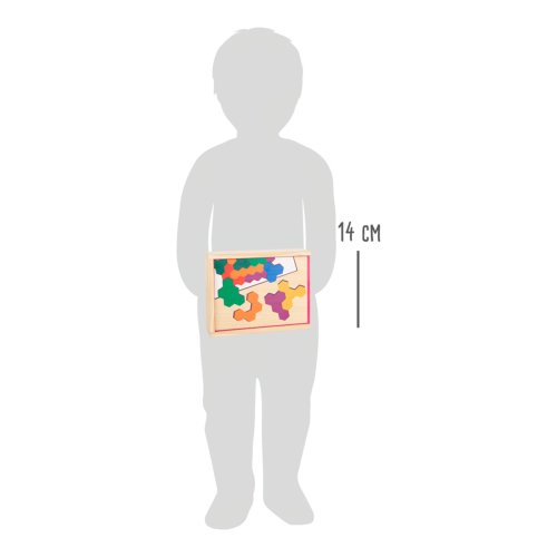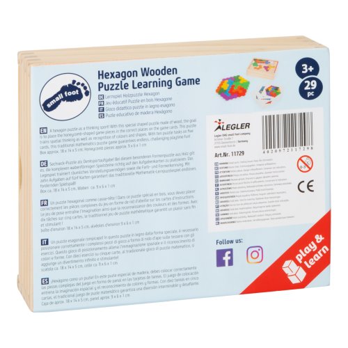 Mozaika ve tvaru hexagonu potrénuje logiku dětí! Speciální puzzle vyrobené ze dřeva je krásně barevné. Cílem je postavit dílky do správného pořadí dle obrázku. Toto puzzle trénuje prostorovou představivost, naučí děti poznávat barvy a tvary. Na pěti kartičkách najdete deset obrázků rozložení puzzle, podle kterých můžete skládat. Všechny dílky jsou bezpečně uloženy v dřevěné krabičce s posuvným víkem. Tato logická hra se hodí také k Small Foot Logické hře (11728), Small Foot Hře logické matematické (11730), Small Foot Vzdělávací hře krmení zvířat (11731). Hlavní vlastnosti: 19 dílkůpraktické balení