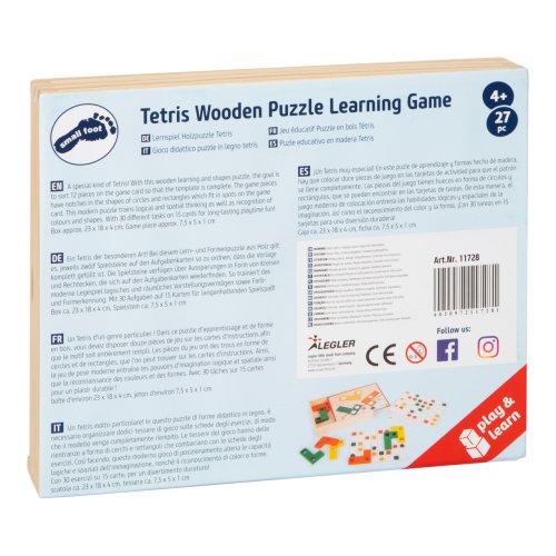 S tímto dřevěným logickým puzzle budete mít za úkol složit 12 dílků na herní kartičky, abyste správně vyplnili všechna místa. Herní dílky v sobě mají různé otvory, kterými je můžete správně uložit na již zmíněné herní kartičky. Toto puzzle trénuje prostorovou představivost, naučí děti poznávat barvy a tvary. Na patnácti kartičkách najdete třicet obrázků rozložení puzzle, podle kterých můžete skládat. Všechny dílky jsou bezpečně uloženy v dřevěné krabičce s posuvným víkem. Tato logická hra se hodí také k Small Foot Logické hře Mozaika (11729), Small Foot Hře logické matematické (11730), Small Foot Vzdělávací hře krmení zvířat (11731). Hlavní vlastnosti: 27 dílků celkempomáhá rozvíjet logiku, jemnou motoriku a představivostodolné dřevěné provedenípraktické balení