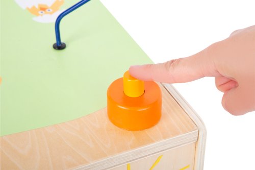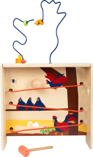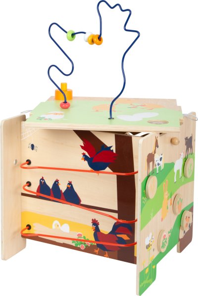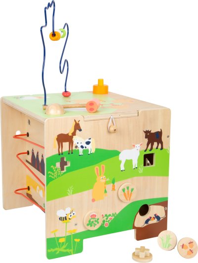 Na vesnici se toho děje opravdu hodně. Korálkový labyrint ve tvaru slepičky, vkládačka, posuvné dílky, hra seřazení barev, zatloukání kladívkem, děti si mohou hrát na všech pěti stranách kostky. Motorická kostka má pěknou ilustraci zvířátek z farmy. Svrchní stranu s labyrintem můžete odvázat a otočit, abyste mohli kostku skladovat bezpečně nebo z ní vytvořili židličku pro děti. Kdo co jí? Ve vkládačce musí děti nakrmit zvířátka správnou potravou. Motorická kostka trénuje poznávání barev a tvarů, také dětem dodá základní informace o zvířatech farmy. Unikátní motorická kostka vyrobená ze dřeva s kovovými prvky. Hlavní vlastnosti motorické aktivity na pěti stranáchvkládačkazatloukačkakorálkový labyrintlze přetransformovat na židličku