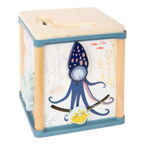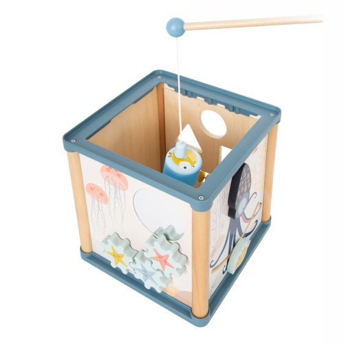 Pod hladinou se pořád něco děje. Motorická kostka přichází nejen s tradiční zábavou na pěti stranách, ale navíc i s magnetickým rybolovem. Lze si tak hrát s korálkovým, nebo posuvným labyrintem, počítadlem, otočným chrastítkem, ozubenými kolečky se zrcátkem, nebo vkládačkou, jejíž dílky lze zevnitř kostky chytat magnetickou udičkou. Jejím prostřednictvím lze procvičovat jemnou motoriku a rozvíjet trpělivost i soustředění. Hračka je bohatě dekorovaná a děti budou při hrách provázet roztodivná stvoření ze světa pod hladinou, chobotnice přitom díky pružině dokonce zábavně pohupuje svým tělem. Všechny díly a korálkový labyrint lze otočením víka prakticky uklidit dovnitř kostky, nebude tak překážet a přitom vyzdobí poličku. Zpracování je robustní a odolné, využívá kombinace silné překližky a masivního dřeva. Hlavní vlastnosti:motorická kostka s víkem, 3 díly vkládačky a magnetická udičkamotorické, zrakové i sluchové atrakcerobustní a odolné provedení