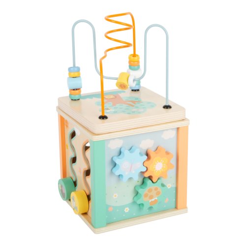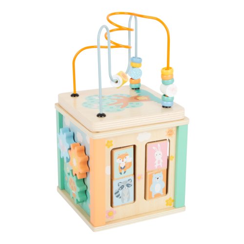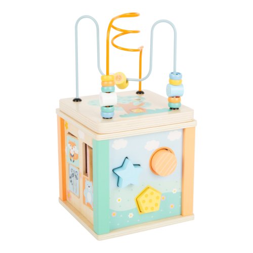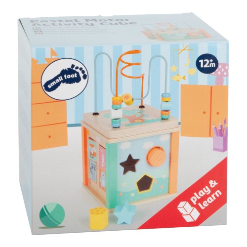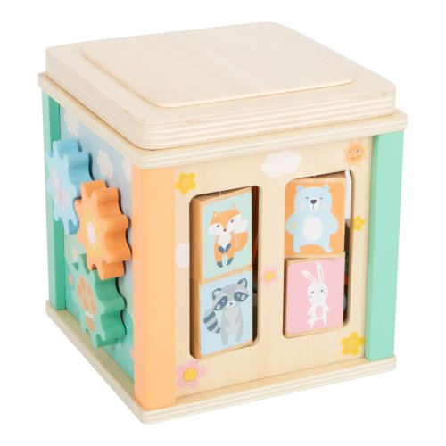 Skládejte, strkejte, klapejte, otáčejte! Můžete si hrát ze všech pěti stran! Dřevěná motoriká kostka nabídne zábavu i nejmenším dětem. Perličkové bludiště, otáčející se obrázky, otvory s kostkami pro vkládání, ozubená kolečka – všechny tyto prvky děti naučí rozevnávat barvy a tvary a také procvičí jejich jemnou motoriku. Trendy pastelové barvy, roztomilé zvířecí motivy, hravé detaily, tato kostka bude pravým poutačem v každém dětském pokojíku. Vrchní víko můžete sundat a uložit do kostky vzhůru nohama, ušetří vám tak kousek místa. Krásná motorická kostka je součástí produktové řady „Pastel“ a zaujme vysokým viditelným podílem dřeva a moderním zabarvením v pastelových barvách. Hlavní vlastnosti: ilustrováno, jemné pastelové barvykompaktní, skladné provedení