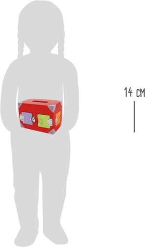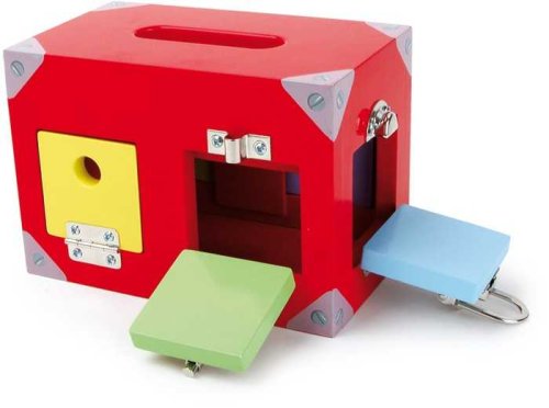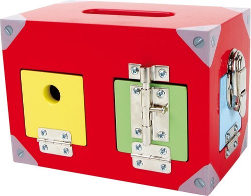 Dřevěný box na hračky s nejrůznějšími zámkovými mechanismy pro procvičování šikovnosti malých prstíků! Děti mohou odemykat a zamykat jednotlivé zámky a procvičovat si jemnou motoriku. Domek má 6 oken a dveří, které se dají otevírat. Otevíratelné části mají odlišné barvy, hračka tedy slouží i jako pomůcka pro rozpoznávání barev. Velikost boxu: 20 x 12 x 14 cm. Vhodné pro děti od 3 let.