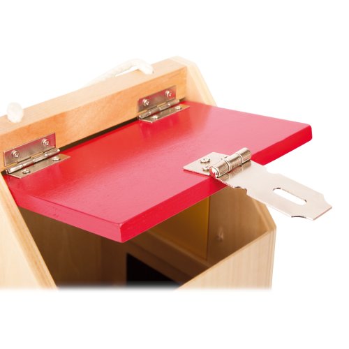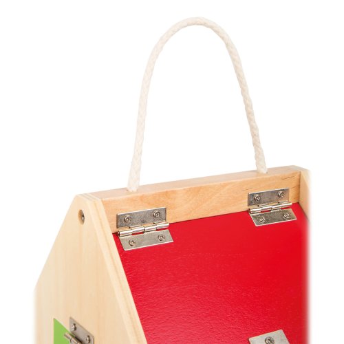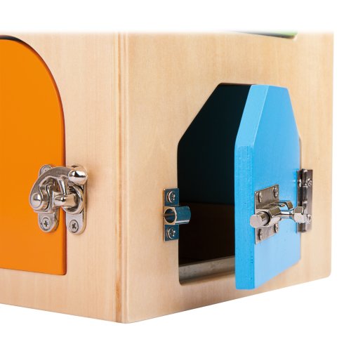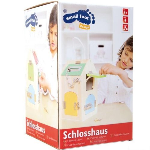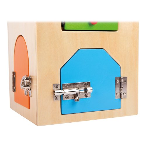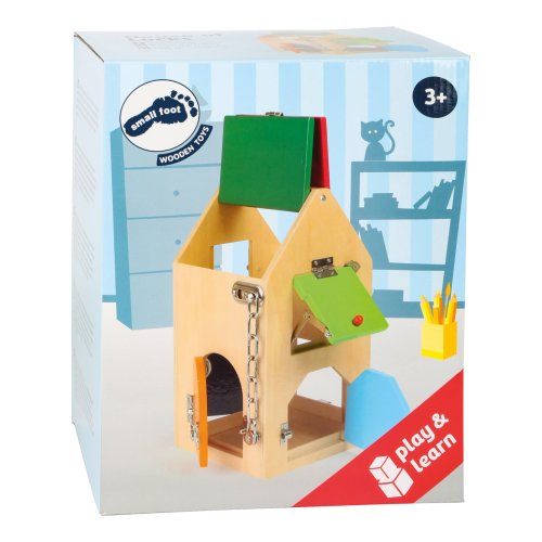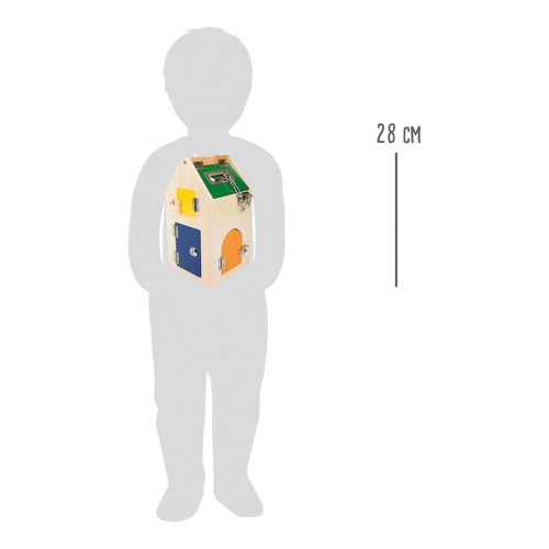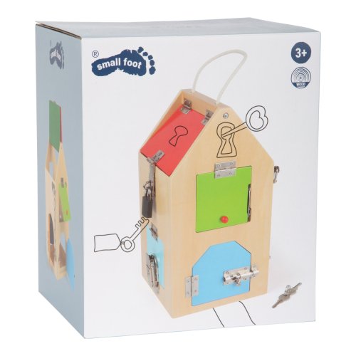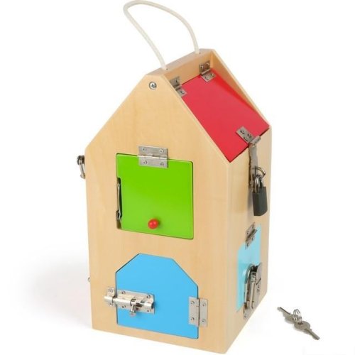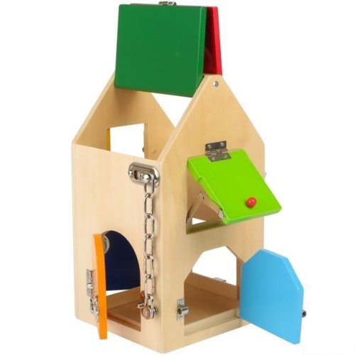 Dřevěný domeček s různými zámky a zápatkami, dveře na řetěz, D-zámky a cylindrické vložky. Tento dům bude mít rád každý správný kluk pro skrývání svých pokladů. Motorická hračka rozvíjí dovednosti dětí!