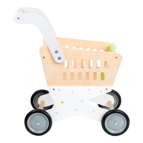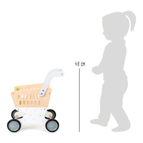 Na nákupy jedině s exkluzivním a elegantním vozíkem! Doplňte jím obchod, či stánek a nechejte své děti rozehrát fantastické hry, jejichž prostřednictvím mohou rozvíjet komunikační dovednosti. Je snadno ovladatelný a nabízí dostatek prostoru, který lze využít i k uložení hraček a vození plyšáků, nebo panenek. Jeho pryžová kolečka zajišťují tichý, kultivovaný chod na všech typech povrchů. Pevné a odolné dřevěné provedení může nabídnout dlouhou životnost a svou barevností vkusně doplní každý dětský pojíček. Výrobek vyžaduje montáž, dodáváno s obrázkovým návodem k sestavení. Hlavní vlastnosti:univerzálně využitelnýtichý, kultivovaný chodrobustní a odolné dřevěné provedení
