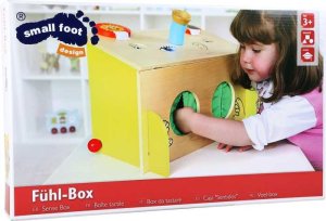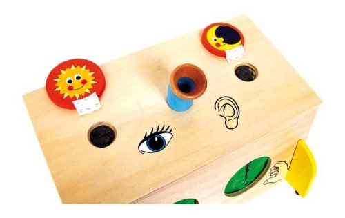 Trénujte všechny své smysly! Tento krásný box je vyroben z přírodního a barevného lakovaného dřeva, najdete v něm dva otvory pro ruce, které jsou překryty textilem, díky kterým budou děti trénovat hmat. Dále jeden otvor s kaleidoskopickým sklíčkem, který potrénuje zrak, a také trychtýř k naslouchání. Co by mohlo být uvnitř? Odklopná víčka svrchních otvorů mají pěkný malovaný motiv slunce a měsíce. Děti se naučí poznávat různé tvary, hmotnosti, materiály... Hlavní vlastnosti: multifunkční, trénuje všechny smyslylakované dřevo a textilodklopná víčka s motivem slunce a měsíce