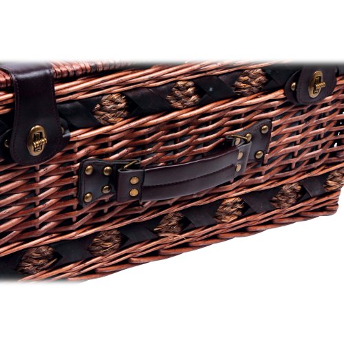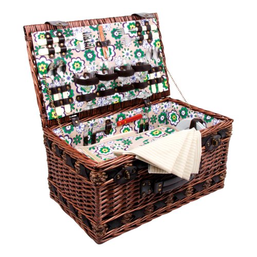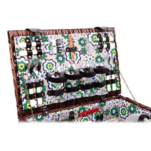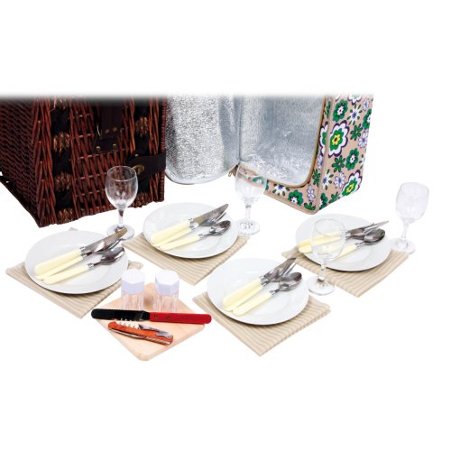 Perfektně vybavený proutěný piknikový koš se silnými proutěnými úchyty a bezpečnými koženými poutky. Koš je kompletně vybavený pro 4 osoby včetně talířů, příborů, sklenic na víno, nožem, pepřenkou, solničkou a ubrousky. Koš je také vybaven vyjímatelnou chladící kapsou, která udržuje jídlo a pití v chladnu! Hlavní vlastnosti: koš je kompletně vybavený, vyrobený z přírodního proutívyjímatelný chladící box