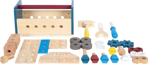 Robustní dřevěná sada nářadí v přepravce s rukojetí. Praktická hračka 2 v 1, když přepravku na nářadí otočíte, můžete ji použít jako pracovní stůl! Díky této vychytávce dětem hračka nabídne nekonečné možnosti hraní, mohou si hrát i na cestách. V balení najdete 3 ks nářadí – kladivo, klíč, šroubovák a další bohaté příslušenství. Nářadí můžete do přepravky jednoduše uložit nebo namontovat díky jejím otvorům. Díky této sadě budou mít malí řemeslníci své vybavení vždy po ruce. Sada obsahuje: přepravka na nářadí, kladivo, klíč, šroubovák, 7 šroubů, 5 matic, 2 velké perforované destičky, 2 malé perforované destičky, 1 středně velká perforovaná destička, 2 perforované destičky ve tvaru diamantu, 2 obdélníkové perforované destičky, 4 silné podložky, 4 tenké podložky, 2 ozubená kola. Hlavní vlastnosti: robustní a odolné provedeníponk a přepravka na nářadí 2 v 13 dřevěné nástroje (kladivo, klíč, šroubovák)komplexní příslušenství včetně šroubů, matic, ozubených kol, sady podložek a perforovaných dílů v různých tvarech a velikostechmnožství herních možností na cestáchtrénuje jemnou motoriku a soustředěnírozvíjí fantazii a kreativituskvěle se hodí k ostatním produktům řady Workshopkompatibilní s produkty řady Nordic, Miniwob