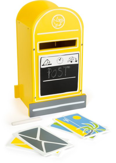 Pošta dorazila! Na tabuli na přední straně schránky lze psát podle potřeby přiloženými křídami. Tuto poštovní sadu doplňují čtyři dřevěné popisovatelné pohlednice a dopisy. Lze ji snadno vyprázdnit dvířky na zadní straně. Hlavní vlastnosti: poštovní schránka a 4 křídou popisovatelná psaní prohlubuje dětskou představivost a kreativitu