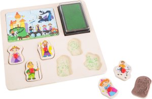 Dřevěná vkládačka pro malé děti s úchytkami a šesti vkládacími obrázky, které jsou ze spodní strany opatřeny razícím štočkem a slouží tak zároveň jako razítka! Součástí vkládačky je také poduška s razítkovací barvou a puzzle se čtyřmi dílky.