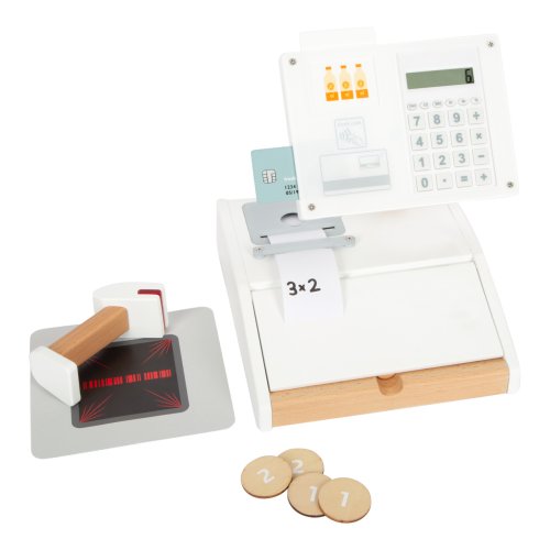 Krásná a moderní pokladna ze dřeva se bude perfektně hodit do dětských prodejních stánků. Má realistické doplňky a zábavné funkce. V balení najdete čtečku čárových kódů, trhací roli účtenek, monitor, skener, debetní kartu, produktové karty, oboustranné dřevěné mince. Dále také fungující kalkulačku, která je integrovaná v monitoru, otevíratelný šuplík pokladny s dvěma přihrádkami, jako v opravdovém supermarketu. Mazatelný fixem se při placení kartou podepište na plexisklo. Baterie nejsou součástí balení.Chcete platit jako ve skutečném supermarketu? Potom je tato pokladna právě pro vás. Zahrajte si na obchod přímo u vás doma, naučíte se používat peníze, zlepšíte se v počtech, při velkých nákupech můžete použít kalkulačku. Vysoce kvalitní pokladna z robustního dřeva potěší všechny malé obchodníky. Hlavní vlastnosti: čtečka čárových kódů, trhací role účtenek, otočný monitor, fungující kalkulačka, platební karta, karty produktů, 15 oboustranných dřevěných mincívelký šuplík pokladny lze otevřítkartičky produktů jsou oboustranné, lze je zasunout do vrchní strany monitorumazatelným fixem se můžete při placení kartou podepisovat na plexiskloděti si při počítání peněz a potravin procvičí matematikukompatibilní s dalšími produkty z řady „Fresh“jednoduchý a moderní nordický design s viditelným dřevem