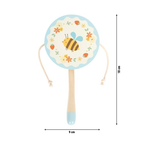Rytmus na dosah ruky! Tento roztomilý bubínek se snadno vejde do malé dětské ručky a přináší spoustu rytmické zábavy! Při hraní navíc podporuje koordinaci oko–ruka a první seznámení se světem zvuků. Rotační bubínek je krásně barevný s veselým motivem včelky a květiny. Je ideální pro malé hudebníky, kteří rádi zkoumají, jak věci zní. Jak to funguje? Stačí uchopit bubínek za dřevěnou rukojeť a roztočit ho mezi dlaněmi. Dvě dřevěné kuličky na provázku začnou při pohybu narážet do bubínku a vytvářejí zábavný rytmický zvuk. Děti si tak přirozeně procvičují motoriku i cit pro rytmus. Hlavní vlastnosti: rozvíjí jemnou a hrubou motorikuzlepšuje koordinaci pohybůpodporuje hudební vnímání