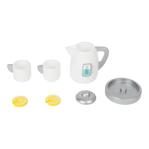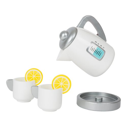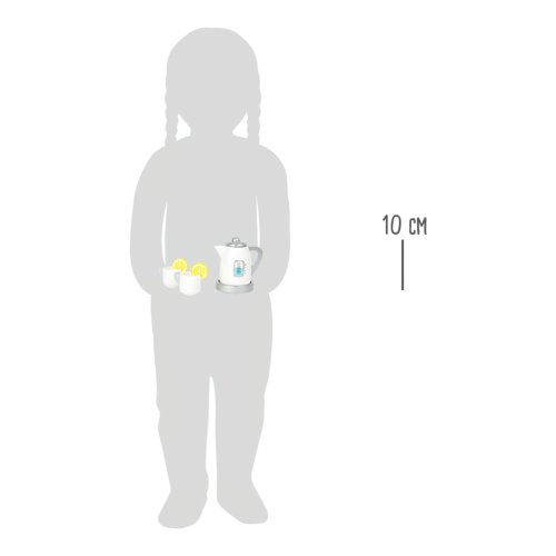 Není nad šálek horkého čaje ozdobený šťavnatým plátkem citrónu! Naučte děti pravidla servisu a společenského chování se soupravou rychlovarné konvice a hrníčků. Skvěle doplní dětské kuchyňky, jiné servisy, snídaňové sady, nebo makety pečiva a zákusků. Součásti jsou vyrobeny z kombinace masivního dřeva a silné překližky, hračka díky tomu může nabídnout vysokou odolnost a životnost. Hlavní vlastnosti:konvice s víčkem a podstavou, 2 šálky a 2 citrónyrobustní a odolné dřevěné provedení