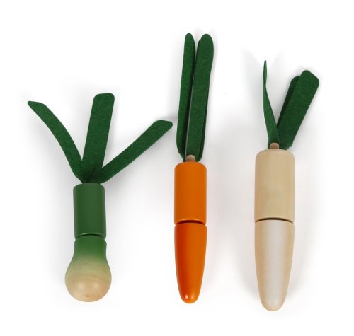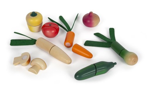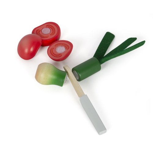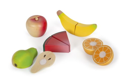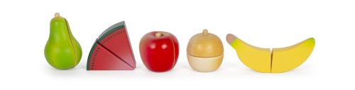 Tato velká sada potravin v praktické bedýnce je nejen nezbytným doplňkem každé kuchyňky, ale také naučí děti rozpoznat základní druhy ovoce a zeleniny a dalších potravin. Pro výrobu bylo použito robustní dřevo a vše je realisticky zpracováno. Potraviny jsou spojeny suchým zipem a děti je mohou snadno „rozkrojit“ pomocí přiloženého nože. Sada obsahuje dřevěný nůž, rajče, okurek, mrkev, jablko, banán, hříbek, papriku, cibuli, pórek, pomeranč, meloun, hrušku, ředkev (pastinák). Opakovaně použitelný obal učí děti zábavnou formou odpovědnosti k životnímu prostředí - omezit odpadky a plýtvání, znovu věci použít, recyklovat. Hlavní vlastnosti: vhodné do dětské kuchyňkydíky suchým zipům lze potraviny „nakrájet“učí děti odpovědnosti k životnímu prostředípodporuje kreativní a nápadité hraní