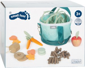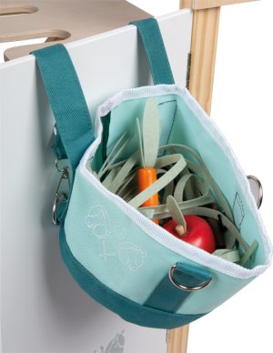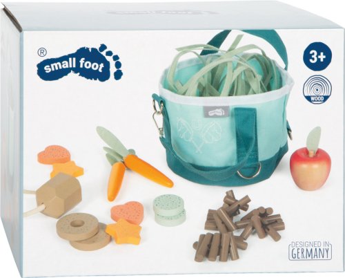 Rozměry: výška tašky 14 cm, Ø 16 cm, mrkev 12 cm Věk: 3+ Materiál: tkanina, látka, dřevo, kov, plsť Obsah balení: 1 taška s krmivem, 28 senných tyčinek, 2 mrkve, 3 granule pro koně, 1 jablko, 1 solný …
