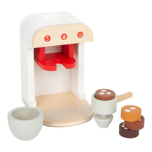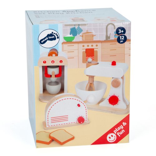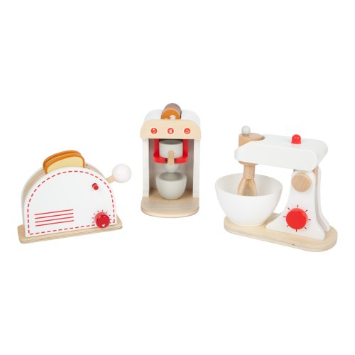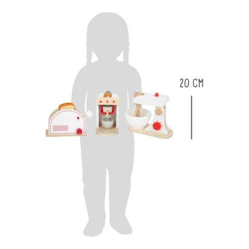 Kompletní sada populárních kuchyňských spotřebičů! Tato sada nabízí toaster, kávovar a mixér, takže vše, co potřebuje každá správná kuchyň. Dřevěné spotřebiče děti podporují ve hře na role, jsou také velmi realistické. Mají klikající ciferníky, toaster má také páčku, kterou „vystřelíte“ opečené toasty, metla mixéru se otáčí. Kávovar má různě silná kávová zrna, takže si můžete udělat espresso, cappuccino nebo latte. Hlavní vlastnosti:mixér s mísou, toustovač se 2 tousty, kávovar s pákou a 4 kapslemi, šálekfunkční, vyjímatelné a pohyblivé součásticvakající otočné knoflíkyrobustní a odolné dřevěné provedení
