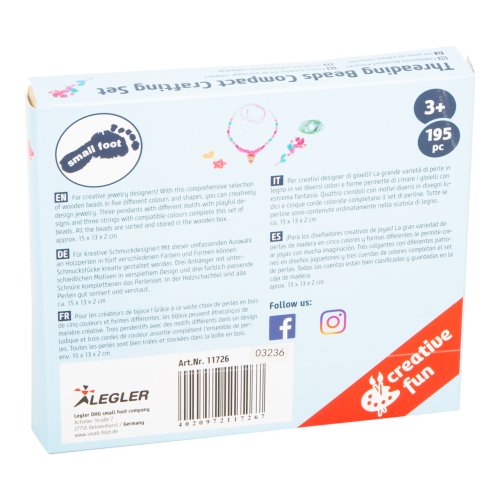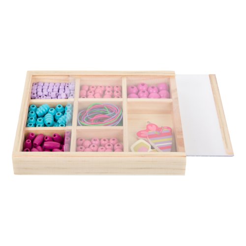 Vyrobte si své šperky s touto sadou korálků v pěti různých barvách a tvarech. Korálkový set doplňují tři přívěsky s různými motivy v hravém designu a tři barevně sladěné šňůry. Vše je uloženo v dřevěné krabici. Navlékáním korálků je podporována jemná motorika dětí. Hlavní vlastnosti: pět různých barev a tvarůpodporuje jemnou motoriku