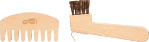 Taška s příslušenstvím na čištění a péči o koně. Je vhodná pro všechny děti, které mají rády koníky. Taška je odolná, praktická a dostatečně prostorná, aby pojala veškeré vybavení. Péče o koně je součástí každodenní rutiny každého fanouška koní a koníci kartáčování milují. Taška s doplňky je vyrobená z vysoce kvalitních materiálů a máte vše, co potřebujete, hned po ruce, i když jste na cestách. Mezi doplňky patří kartáč, hřeben, škrabka na kopyta a hřeben na hřívu, to vše se vejde do prostorného vnitřku tašky a do malé boční kapsy. A samozřejmě nechybí dřevěné jablko a mrkev. Sada se dodává s turnajovou stuhou, kterou si děti mohou připevnit na obojek hlavy svého koníka nebo na vlastní oblečení. Pomůcky na čištění koní jsou dokonale přizpůsobeny potřebám mladých fanoušků koní, takže mladí jezdci mohou při hře popustit uzdu své fantazii. Pohodlná stahovací šňůrka umožňuje tašku doširoka otevřít, ale také úplně zavřít. Tuto tašku pro děti lze nosit za obě uši nebo nastavitelný ramenní popruh. S touto sadou péče se mohou děti starat o svého oblíbeného koně stejně jako profesionálové. Hlavní vlastnosti: nezbytné příslušenství v tašce pro každého fanouška konínastavitelný ramenní popruhkomplexní sada
