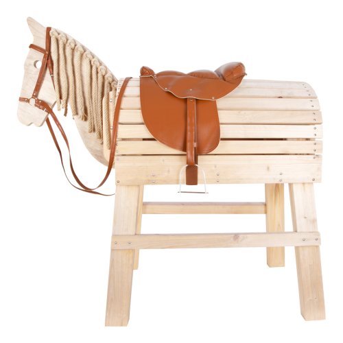 S touto sadou sedla a uzdy jsou mladí jezdci stylově vybaveni na vyjížďku na svém dřevěném koni! Lehké jezdecké sedlo z odolného materiálu má extra měkké polstrování pro pohodlné sezení. Součástí je sedlový řemen, kovové třmeny a nastavitelné třmenové řemínky. Uzdečka (bez udidla) je také vyrobena z umělé kůže a má nastavitelné některé řemeny. Jakého koně si osedláte a kam se na něm vydáte? Hlavní vlastnosti: nastavitelné řemínkynavrženo jako doplněk Dřevěného koně (LE11664), vhodné i pro jiné dřevěné a houpací koněprodukt díky kterému je hraní rolí opravdu realistické