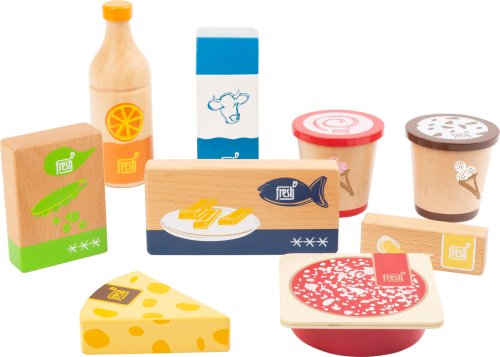 Týdenní nákup potravin bude díky tomuto setu rychlovka! Najdete zde pomerančový džus, dvě balení zmrzliny, balení hrášku, rybí prsty, máslo, sýr, krájený salám a krabici mléka. 9 dílná souprava vám jednoduše splní všechna přání! Děti si se sadou opravdu vyhrají. Nejprve "nakoupí" a pak uloží potraviny do své dětské kuchyně nebo prodejního stánku. Hračka disponuje přírodním designem ve spojení s elegantními ilustracemi a je vyrobena z pevného dřeva (tudíž slibuje dlouhotrvající kvalitu). Hlavní vlastnosti: vhodné jako doplněk kuchyňky, obchodu, či stánkupodporuje hraní rolí a kreativitu