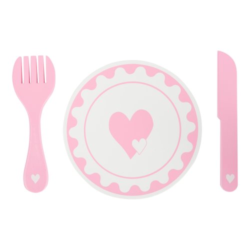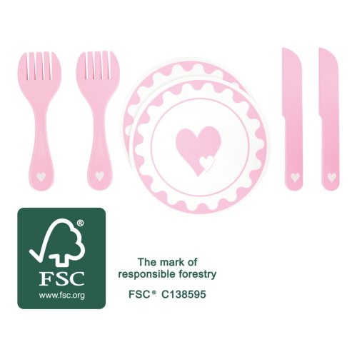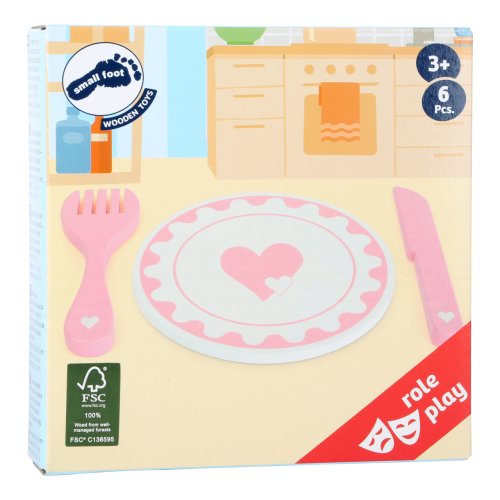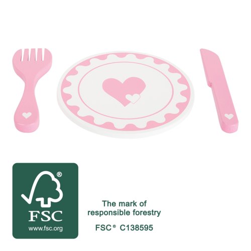 Pohádkové prostírání! Jídlo z dětské kuchyňky bude díky těmto talířům chutnat ještě lépe a děti se při hře mohou naučit správnému stolování. Malý dřevěný servis je dekorován srdíčky. Vyrobeno ze 100% certifikovaného FSC® dřeva. Hlavní vlastnosti: 2 talíře, 2 vidličky a 2 nožerozvíjí jemnou motoriku dětípodporuje zvídavostvyrobeno z 100% FSC dřeva Značka a certifikát FSC® (Forest Stewardship Council) zaručuje, že dřevo, ze kterého byl produkt vyroben, nebylo vytěženo nelegálně a pochází z lesů obhospodařovaných šetrným či přírodě blízkým způsobem, ve kterém jsou dodržovány přísné environmentální a sociální požadavky. Značka FSC® na výrobku znamená, že svým nákupem pomáháte chránit lesy a podporujete šetrné, odpovědné či přírodě blízké hospodaření, díky kterému jsou naše lesy stabilnější, zdravější, mají přirozenou druhovou skladbu a lépe odolávají negativním následkům klimatických změn.