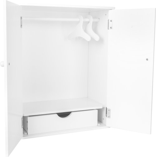 Organizace je polovina úspěchu! Tato šatní skříň pro panenky v jednoduchém designu zaujme zákazníky svou pohodlnou konfigurací. Malým dětem umožňuje hravě udržet ve všem pořádek. Oblečení panenek lze zavěsit na integrovaná ramínka nebo položit na police. Výsuvná zásuvka nabízí také prostor pro vybrané věci pro panenky. Hlavní vlastnosti: všechny jejich oblíbené outfity panenek jsou na jednom místěpraktický doplněk sady nábytku pro panenky součástí jsou dvě ramínka na šaty