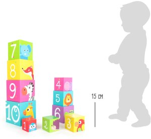 Jak vysoký bude tvůj komín? Každý malý stavitel si může v pohodlí domova postavit vysokou věž z dřevěných kostek. Kostičky jsou různě veliké a barevné. Mají nejrůznější potisky - zvířátka, čísla, barvy nebo obrázky v různém počtu pro první počítání. Obsah balení: 10 kusů kostiček, které jdou složit do jedné velké kostky. Nevhodné pro děti do 12 měsíců.