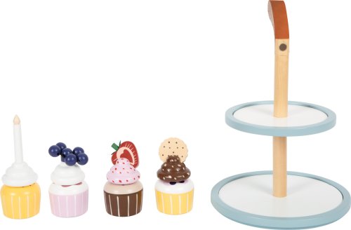 Lahůdky do dětské kuchyňky. Tento stojan se čtyřmi košíčky zve malé cukráře k aktivnímu hraní a prezentování lahodných muffinů. Stojan má dvě patra, které slouží k vystavení cukrovinek ve vrstvách. Systém kombinovatelných podstavců a krémových vršků umožňuje široké možnosti kombinací. Jednotlivé dílky společně drží pomocí integrovaných magnetů. Sada je doplněna o dvojitou sušenku, jahodový řez, borůvky a narozeninovou svíčku, kterou lze dorty ozdobit. To povzbudí chuť na čaj s panenkami, medvídky atd. Komu se z toho pohledu nesbíhají sliny? Ideální doplněk do kuchyňky a obchodu s potravinami. Detaily, jako je držadlo z tmavě hnědé imitace kůže, integrované magnety a moderní, decentní skandinávské barvy dělají ze stojanu vysoce kvalitní a stylovou upoutávku do dětského pokoje. Hlavní vlastnosti: decentní skandinávské barvy inspiruje a podněcuje ke konverzaci1 stojan, 4 muffiny, 4 polevy, 1 svíčka, 1 sušenka, 1 jahoda, 1 borůvka