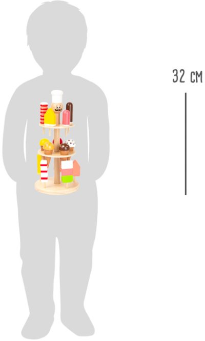 Mňam ... zmrzlina! Tento láskyplně navržený stojan na zmrzlinu z masivního dřeva splňuje všechna zmrzlinová přání. Zde si děti mohou vybrat svou oblíbenou zmrzlinu. Ať už jde o nanuky nebo zmrzlinu ve vaflovém kornoutku - není to snadné rozhodnutí! Různé příchutě zmrzliny lze snadno dát do stojanu na zmrzlinu, což z nich činí skutečný poutač na prodejním pultu v obchodě nebo v dětské kuchyňce či kavárničce. Hlavní vlastnosti: Podporuje sociální dovednosti a jemnou motoriku dětí