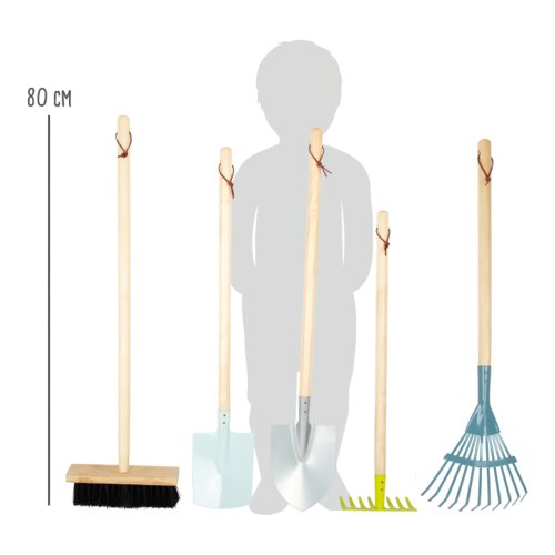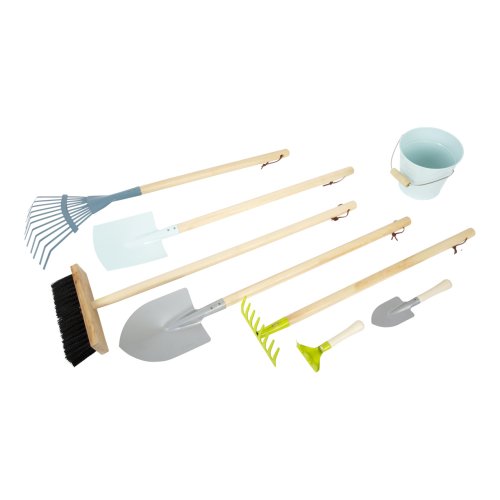Tato komplexní sada zahradního nářadí v moderních barvách se skládá z rýče, lopaty, hrábek, košťete, lopaty a dvou malých zahradnických nástrojů pro práci na zahradě. Po dokončení práce lze nástroje z robustního dřeva a kovu řádně zavěsit na praktické smyčky. Tato sada je skutečná „nutnost“ pro všechny mladé zahradní pomocníky. Oblíbená moderní, komplexní sada pro váš sortiment venkovního zahradního nářadí. Hlavní vlastnosti: 8 ks praktické smyčky pro zavěšeníoblíbená, moderní sada