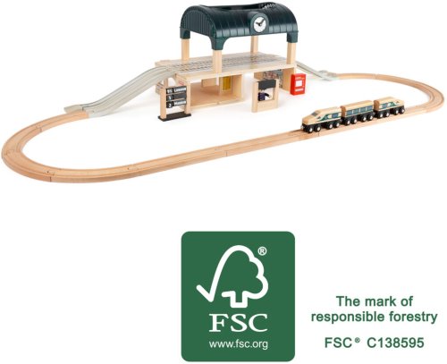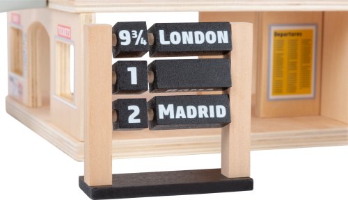 Ukončete nástup, dveře se zavírají. Dvoupatrové vlakové nádraží je vyrobeno ze 100% FSC dřeva, má mnoho doplňků jako obchod, automat na lístky, zobrazovací displej s destinacemi (na který můžete psát), hodiny. V balení samozřejmě i vlak. Nádraží je jako opravdové! Díky otevřené střeše je zde mnoho místa pro hru. Další skvělá věc, díky hlubšímu profilu kolejnic na nich mohou jezdit i vlaky na baterky (není součástí balení). S touto hračkou se každý dětský pokoj promění ve velkoměstskou vlakovou stanici! Hlavní vlastnosti: 100% FSC dřevostanice s mnoha detaily a funkčními prvky Značka a certifikát FSC® (Forest Stewardship Council) zaručuje, že dřevo, ze kterého byl produkt vyroben, nebylo vytěženo nelegálně a pochází z lesů obhospodařovaných šetrným či přírodě blízkým způsobem, ve kterém jsou dodržovány přísné environmentální a sociální požadavky. Značka FSC® na výrobku znamená, že svým nákupem pomáháte chránit lesy a podporujete šetrné, odpovědné či přírodě blízké hospodaření, díky kterému jsou naše lesy stabilnější, zdravější, mají přirozenou druhovou skladbu a lépe odolávají negativním následkům klimatických změn.
