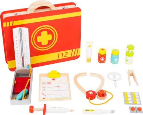 Trendy lékařská souprava v kufříku pro mladé doktory a doktorky. Všechny předstírané lékařské úkony u lékaře, nebo na pohotovosti, zvládnou děti v dětském pokojíčku s tímto dřevěným lékařským kufříkem.Početné náčiní splní přání každého mladého lékaře. Injekční stříkačky a nádobky na masti jsou dokonce vybaveny funkcí pumpy. Takto si mohou všechny panenky a medvídci nechat změřit krevní tlak a ošetřit drobné ranky. Všechna ošetření lze nakonec zapsat do praktické lékařské dokumentace. Komplexní vybavení včetně tlakoměru, lékařské dokumentace, stetoskopu, pinzety, teploměru, stříkačky, nůžek, dávkovače dezinfekčního roztoku s pumpičkou. Obsahuje také tubu na mast, nádobky na tablety a blistrové balení tablet. Hračka dětem pomůže s rozvojem sociálních dovedností a vypravěčství. Další, prosím! Hlavní vlastnosti: lékařská souprava se spoustou dřevěného lékařského vybavenípružné elastické pásky a oddělené přihrádky udrží léky a lékařské vybavení na místě klasické doktorské symboly a kresby, které jsou pro děti snadno srozumitelnépodporuje aktivní hraní a rozvíjí sociální dovednosti