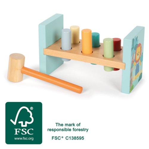 Užijte si zábavu s přáteli z džungle! Tato krásně navržená zatloukačka z 100% FSC® certifikovaného dřeva přináší do dětského pokoje hodiny radosti a hry. Děti pomocí malého kladívka zatloukají barevné dřevěné válečky skrz bezpečné gumové otvory, přičemž hravě rozvíjejí jemnou motoriku, koordinaci ruka-oko a přesné uchopení.Jakmile jsou všechny válečky zatlučené, stačí zatloukačku otočit a zábava začíná znovu! Veselé motivy zvířátek z džungle a barevné provedení podporují dětskou fantazii a zvědavost.Odolné dřevěné zpracování, dětský design a viditelný podíl přírodního dřeva zaručují, že hračka je nejen krásná, ale i robustní, bezpečná a připravená na každé dobrodružství malých objevitelů. Hlavní vlastnosti: vyrobeno ze 100% certifikovaného dřeva FSC®rozvíjí jemnou motoriku a sílu úchopuučí koordinaci pohybu, trpělivost a soustředěnímilé ilustrace zvířatpogumované otvory drží dřevěné válce na místě Značka a certifikát FSC® (Forest Stewardship Council) zaručuje, že dřevo, ze kterého byl produkt vyroben, nebylo vytěženo nelegálně a pochází z lesů obhospodařovaných šetrným či přírodě blízkým způsobem, ve kterém jsou dodržovány přísné environmentální a sociální požadavky. Značka FSC® na výrobku znamená, že svým nákupem pomáháte chránit lesy a podporujete šetrné, odpovědné či přírodě blízké hospodaření, díky kterému jsou naše lesy stabilnější, zdravější, mají přirozenou druhovou skladbu a lépe odolávají negativním následkům klimatických změn.