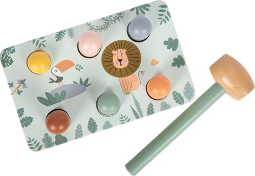 Tato nádherně zpracovaná zatloukací hra v safari stylu je vyrobena ze 100% FSC® certifikovaného dřeva a zve děti ke hraní plnému překvapení! Pomocí kladívka děti zatloukají dřevěné kolíčky do lavičky, a právě tehdy přichází ten správný efekt, když zatlučou jeden kolík, na opačné straně vyskočí druhý! Roztomilé zvířecí motivy a moderní barevné provedení podněcují dětskou fantazii a chuť objevovat. Pohyblivé kolíčky zároveň dětem ukazují princip příčiny a následku, ideální pro hravé učení. Tato hračka je dlouhotrvajícím společníkem, který spojuje radost ze hry s rozvojem důležitých dovedností a navíc skvěle vypadá! Hlavní vlastnosti: vyrobeno ze 100% FSC® certifikovaného dřevapodporuje rychlé reakce, motoriku a koordinaci ruka-okopevné a odolné zpracováníkladívko padne skvěle do dětských ručičekkrásný designstimuluje dětskou fantazii Značka a certifikát FSC® (Forest Stewardship Council) zaručuje, že dřevo, ze kterého byl produkt vyroben, nebylo vytěženo nelegálně a pochází z lesů obhospodařovaných šetrným či přírodě blízkým způsobem, ve kterém jsou dodržovány přísné environmentální a sociální požadavky. Značka FSC® na výrobku znamená, že svým nákupem pomáháte chránit lesy a podporujete šetrné, odpovědné či přírodě blízké hospodaření, díky kterému jsou naše lesy stabilnější, zdravější, mají přirozenou druhovou skladbu a lépe odolávají negativním následkům klimatických změn.