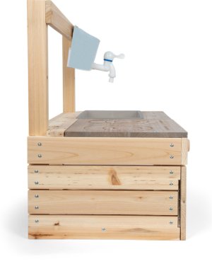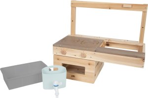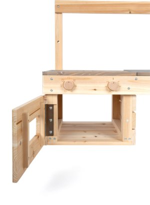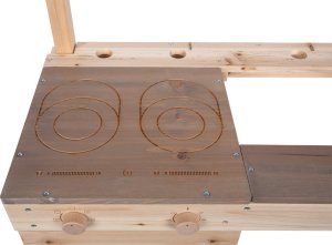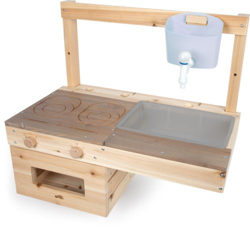 Chytré řešení pro kreativní kulinářské zážitky i v těch nejmenších prostorech! Tato prostorově úsporná venkovní kuchyňka je díky své kompaktní konstrukci ideální volbou pro menší zahrady, terasy nebo dětská hřiště. Můžete ji snadno zavěsit na herní sestavu, zahradní domek nebo jakoukoli stěnu a vytvořit tak dětem stylový herní kout. Kuchyňka je vybavena varnou deskou s gravírovanými zónami a dotykovým ovládáním, praktickou troubou se dvěma otočnými knoflíky a nechybí ani závěsný zásobník na vodu s funkčním kohoutkem a dřezem. Pracovní plocha je pro vyšší odolnost ošetřena nátěrem v kontrastní barvě, který podtrhuje moderní vzhled hračky. Díky praktickým výřezům v desce mají malí kuchaři své vařečky, klacíky a další nezbytné náčiní neustále při ruce. Tato robustní konstrukce umožňuje dětem naplno rozvinout fantazii při vaření z bláta a vody, aniž by zabírala místo na zemi. Lakovaný povrch pracovní desky poskytuje elegantní kontrast k přírodnímu dřevu a dodává celku šmrnc. Aby vám kuchyňka dělala radost co nejdéle, doporučujeme neošetřené dřevěné části ošetřit vhodnou impregnací. Upozorňujeme, že prvky pro samotné upevnění na stěnu nejsou součástí dodávky. Hlavní vlastnosti: kompaktní kuchyňka z neošetřeného masivního dřeva v závěsném provedenípracovní plocha s odolným nátěrem proti povětrnostním vlivůmzávěsná nádoba na vodu s funkčním kohoutkem a vyjímatelným dřezemvybavena varnou deskou a troubou včetně gravírovaných ovládacích prvků a otočných knoflíkůurčena pro nástěnnou montáž na zahradní domky a další svislé plochyrobustní a variabilní provedení, které se přizpůsobí vašim potřebámideální řešení pro malé zahrady, terasy nebo balkony