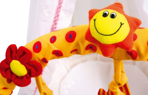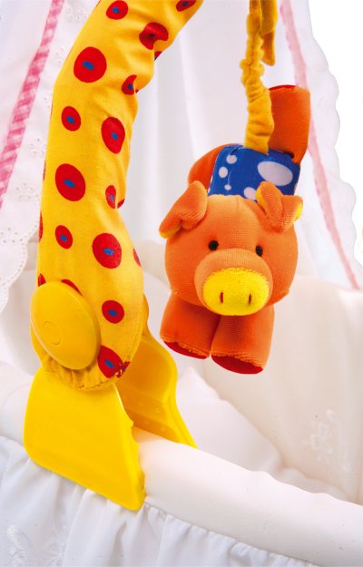 Hezké zaměstnání dětských očí, ohebný, látkou potažený plastový/kovový oblouk lze připevnit svorkami na kočárek, dětskou postýlku nebo na golfový kočárek. Při pohybu začnou barevná zvířátka „létat“ a rozezní rolničky nacházející se uvnitř zvířátek! Rozdílné látky osloví hmatový smysl miminek a vzbudí v nich nadšení z vlastních pohybů! Hlavní vlastnosti: trénuje koordinaci ruka-okomultisenzorická hračka, probudí zvědavost a stimuluje smysly