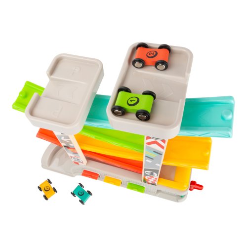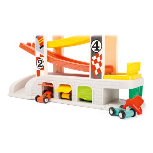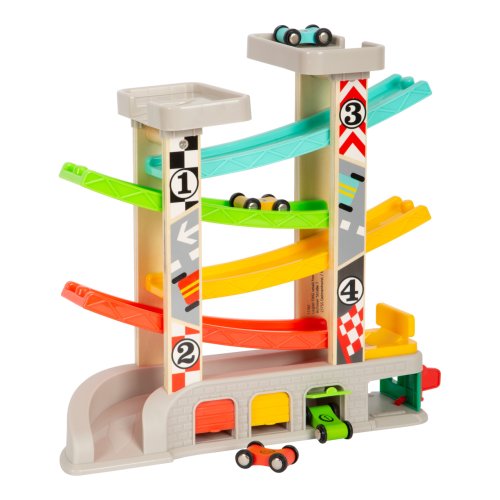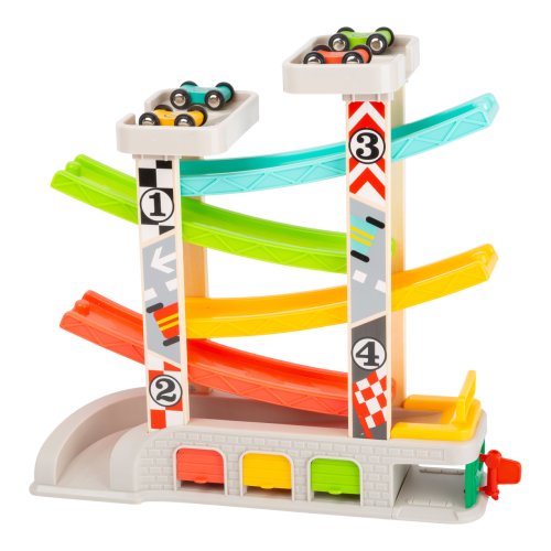 Prohánějte autíčka rychlostní kaskádou, jeden závodník může v těsném závěsu stíhat druhého v atmosféře plné napětí. Dráha je vybavena nejen dvojicí startovacích plošin, ale i zastávkou v boxech, díky které lze rozehrát hry rozvíjející dětskou představivost. U paty dráhy naleznete garáže s otevíratelnými dvířky, kde mohou autíčka odpočívat mezi závody a lze je prakticky využít k úklidu i přenášení hračky. Robustní a odolné provedení kombinuje plastové a atraktivně potištěné dřevěné díly. Díky své jedinečné barevnosti kaskáda snadno upoutá pozornost a podnítí dětskou zvědavost. Hlavní vlastnosti:dráha a 4 různobarevná autíčka3 garáže a tankovací boxatraktivní a odolné zpracování