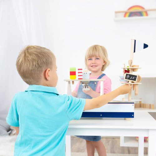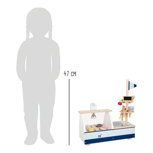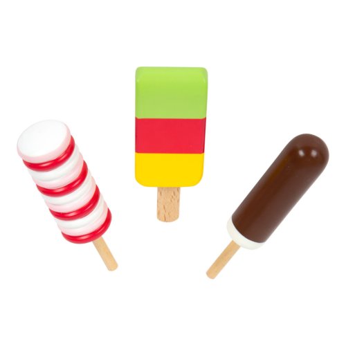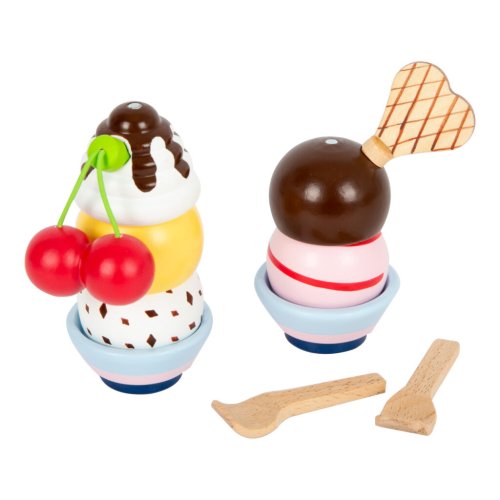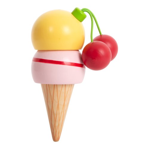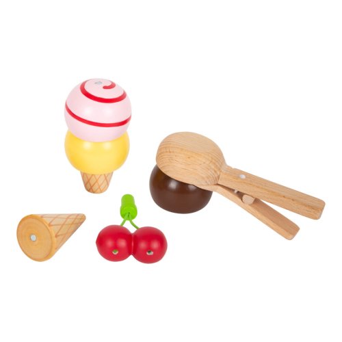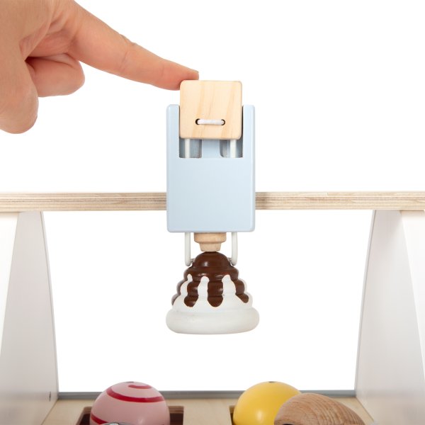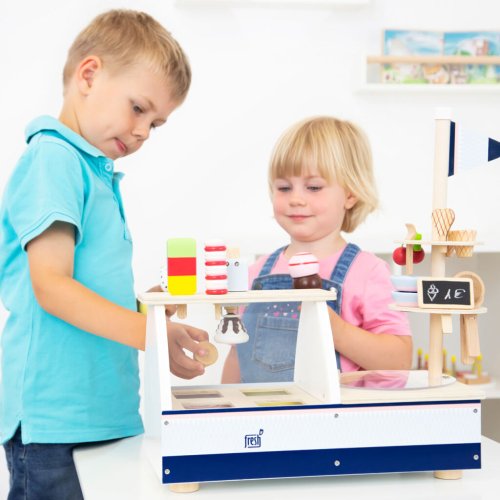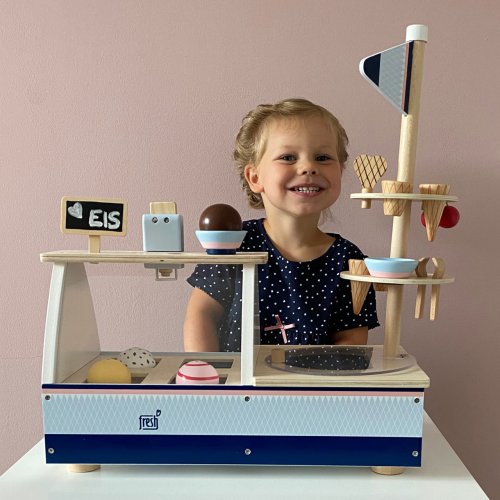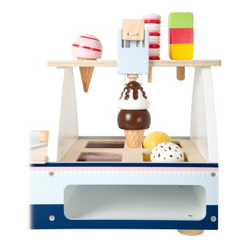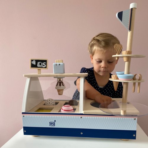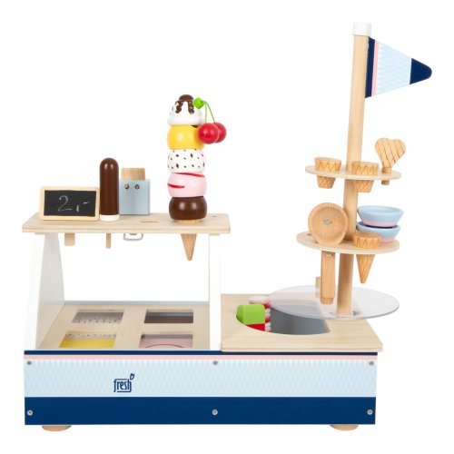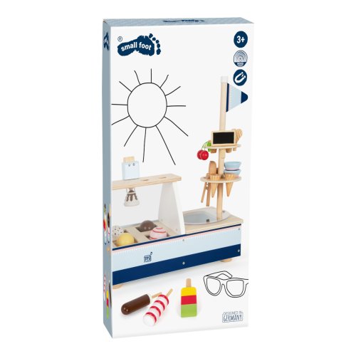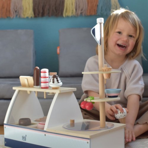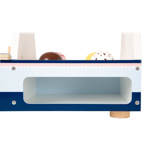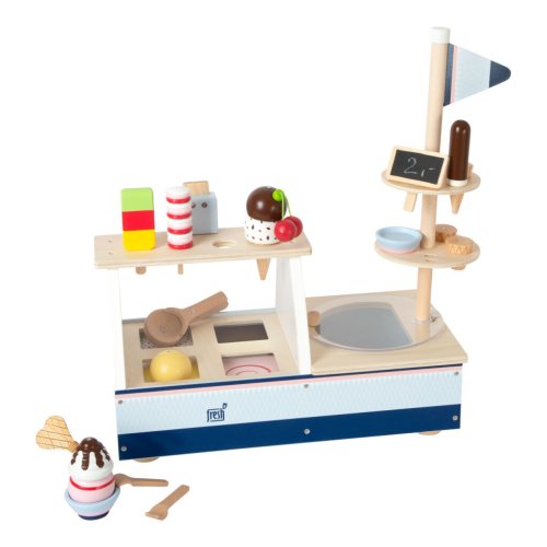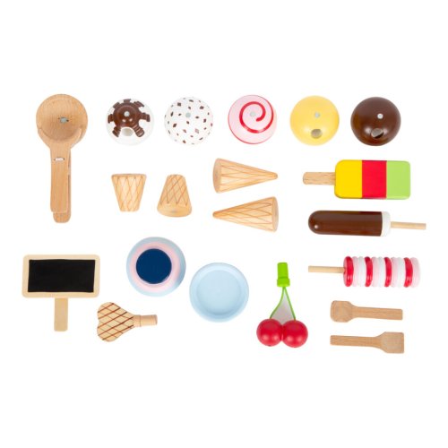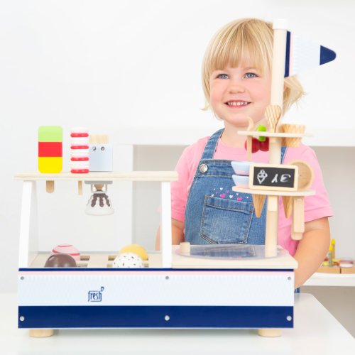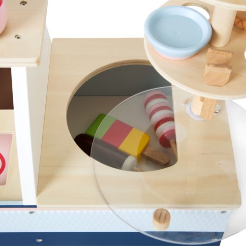 Jdeme na zmrzlinu! Tento dřevěný zmrzlinový set je perfektní na léto i zimu. Zmrzlinový stánek je modro-růžový, má také prvky přírodního dřeva, zákazníky nadchne velkým výběrem dezertů a svými funkcemi a příslušenstvím. Můžete si dát více kopečků zmrzliny, nanuk, točenou zmrzlinu, poháry, wafle... a to vše ozdobit třešničkou. Stánek má také plastovou vitrínu, mrazničku s plastovým poklopem, stojan na kornouty. Kopečky zmrzliny a točená zmrzlina jsou magnetické, v balení také najdete tabulku, na kterou můžete psát křídou. Zmrzlinu (vanilku, čokoládu, stracciatellu a jahodu) můžete z vitríny vyndat a dát ji do misky nebo kornoutu. Všechny se také vejdou na wafli. Vytvořte si dezert dle svého gusta. Zmrzlinový stánek má také úložný prostor. Hlavní vlastnosti Zmrlinové kopečky a točená zmrzlina s magnetyOsm různých příchutí zmrzliny, nanukyKopečky se dají skládat na sebe díky magnetůmVelké a malé zmrzlinové kornouty, misky se lžícemi, wafleStánek s plastovou vitrínou, mraznička s průhledným poklopemGenderově neutrální, jemný design