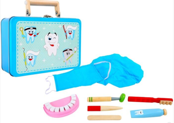Nebojte se zubaře! S touto dřevěnou zubařskou sadou se děti mohou připravit na další návštěvu u zubaře a zkontrolovat, zda mají medvídci a panenky zuby v pořádku. S rouškou a látkovou čepicí se děti během chvilky promění ve skutečné zubaře. Díky kovovému kufříku je sada ideální i na cesty. Pokud chcete své děti připravit na zubaře, s touto herní sadou to hravě zvládnete. Balení obsahuje: roušku, čepici, zuby, kartáček, pastu, zrcátko a dašlí náčiní