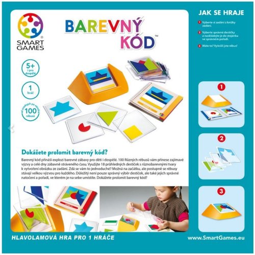 Barevný kód přináší explozi barevné zábavy pro děti i dospělé. 100 Různých rébusů zadání vám přinese zajímavé výzvy a celé dny zábavně stráveného času. Využijte 18 průhledných destiček s různobarevnými tvary k vytvoření obrázku ze zadání. Zdá se vám to jednoduché? Možná na začátku, ale postupně se rébusy stávají velkou výzvou pro každého. Důležitý není pouze správný výběr destiček, ale také jejich správné natočení a pořadí, ve kterém je na sebe umístíte. Dokážete prolomit barevný kód? Zadání obsahuje různě obtížné úlohy.