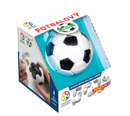 p bFotbalový míč je chytlavý 3D hlavolam pro jednoho hráče, ve kterém se snažíte sestavit celý míč z 7 bílých dílků na černém jádře. Sami volíte startovní pozici pro dvoupolní dílek z 24 možností a musíte dodržet pravidlo střídání prohlubní. Nacvakněte zbylých 6 dílků a najděte jedno z mnoha možných řešení, jak míč kompletovat!/b /ppPředstavujeme vám Fotbalový míč, originální prostorový hlavolam z dílny Smart Games, který prověří vaši představivost a logiku! Tato 3D skládačka pro jednoho hráče vás vyzve k tomu, abyste na černé jádro míče nacvakli všech 7 bílých dílků a sestavili tak kompletní míč. Hra je ideální pro každého, kdo má rád hmatatelné a vizuálně atraktivní logické výzvy./ppHra začíná s černým jádrem, ze kterého odstraníte všech 7 bílých dílků. Těchto sedm dílků tvoří skládačku: šest z nich se skládá ze tří polí a jeden startovní dílek se skládá ze dvou polí./ppNa začátku si sami zvolíte startovní pozici pro dvoupolní startovní dílek, který lze umístit na 24 možných pozic. Klíčové pravidlo zní: startovní dílek musí vždy zakrýt jedno pole jádra s prohlubní a jedno pole bez prohlubně. Pokud byste zakryli dvě pole s prohlubní, úloha by neměla řešení. Po určení startovní pozice musíte na jádro nacvaknout všech 6 zbylých dílků bez změny polohy startovního dílku. Výstupky na dílcích je nutné zacvaknout do prohlubní na jádru. Cílem je sestavit celý míč./ppTento hlavolam nabízí vysokou znovuhratelnost, protože si sami volíte startovní pozici, a navíc často existuje více správných řešení pro dané zadání. Fotbalový míč je skvělá kompaktní hra, kterou si můžete vzít kamkoliv!/pp bPočet hráčů:/b 1brbHerní doba:/b 5 min/pp bHerní materiál:/b br• Černé jádro míče (s poli s prohlubněmi a bez prohlubní)br• 7 bílých dílků skládačkybr• Pravidla hry/p