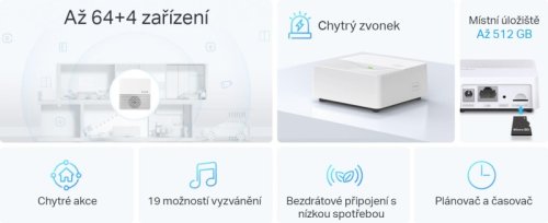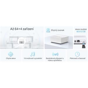 Tapo H200 je klíčová brána do Tapo ekosystému plného ovládacích prvků, čidel, senzorů, osvětlení, zásuvek, kamer a dalšího příslušenství. Tato IoT gateway slouží pro připojení až 64 senzorů, přepínače, tlačítka a TRV pracující na frekvenci sub-1G (863, 864 a 868 MHz), zároveň se do sítě a cloudovou komunikaci připojuje pomocí 2,4GHz WiFi. Zařízení funguje jako chytrý zvonek s výběrem až z 19ti vyzváněcích melodií nebo jako alarm s 90 dB akustickým bezpečnostním upozorněním.