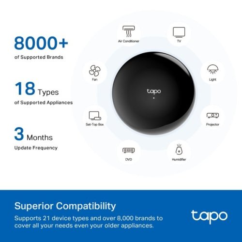 – Podporuje 18 typov zariadení a viac ako 8 000 značiek, aby pokryla všetky vaše potreby, dokonca aj staršie spotrebiče. Databáza kompatibility je aktualizovaná každé 3 mesiace, aby podporovala najnovšie modely. Hlasové ovládanie bez použitia rúk