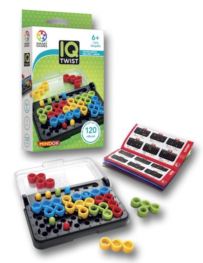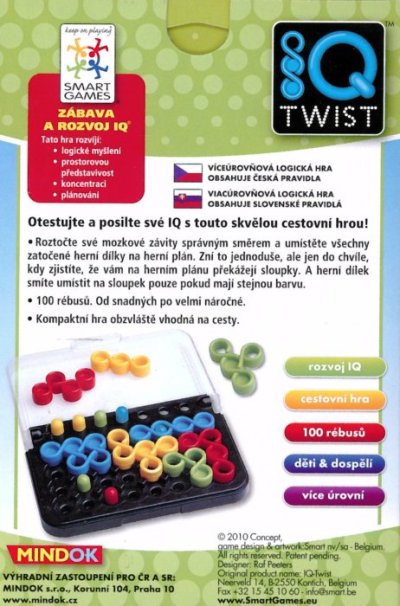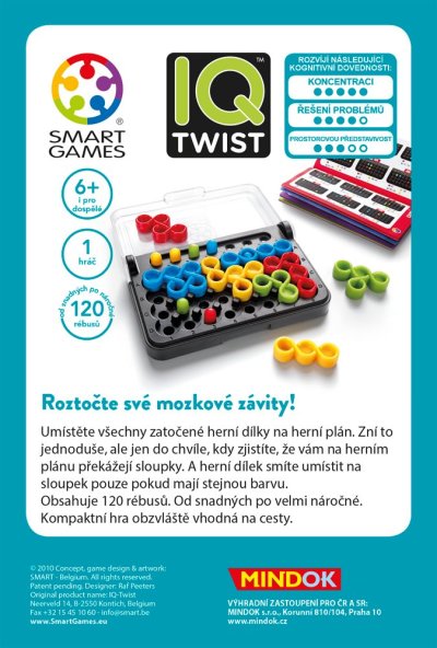 S touto skvělou cestovní hrou roztočte své mozkové závity správným směrem a umístěte všechny zatočené herní dílky na herní plán. Zní to jednoduše, ale jen do chvíle, kdy zjistíte, že vám na herním plánu překážejí sloupky. A herní dílek smíte umístit na sloupek pouze pokud mají stejnou barvu. Tato hra je kompaktní, obzvláště vhodná na cesty. Zadání obsahuje 100 různě obtížných úloh. Hra IQ Twist patří do skupiny víceúrovňových, logických her Smart games , které jsou určeny především pro jednoho hráče (nicméně hru může hrát i hráčů více). Logické hry Smart Games obsahují vždy zadání v několika různých stupních obtížnosti, rozvíjí IQ, logické myšlelní, prostorovou představivost, koncentraci a plánování. Pravidla hry: Umístěte všechny zatočené herní dílky na herní plán, nesmí vám překážet sloupky. Herní dílek smíte umístit na sloupek pouze pokud mají stejnou barvou. Hra obsahuje: Rébusy, pravidla hry